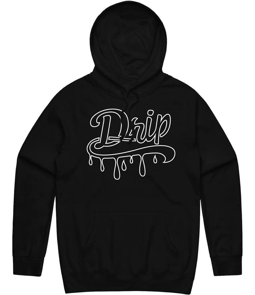 The Drip Outline Hoodie – Black offers a simple, modern design with direct-to-garment printing on a soft cotton-polyester blend for ultimate comfort.